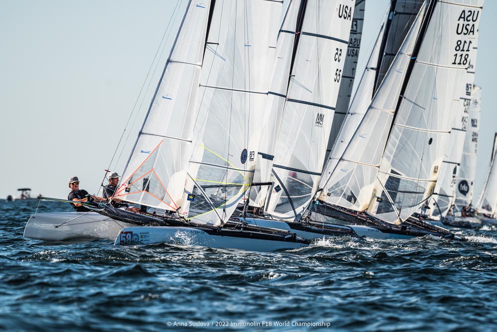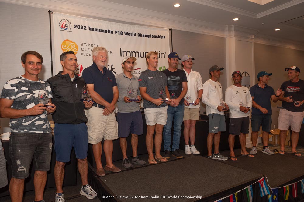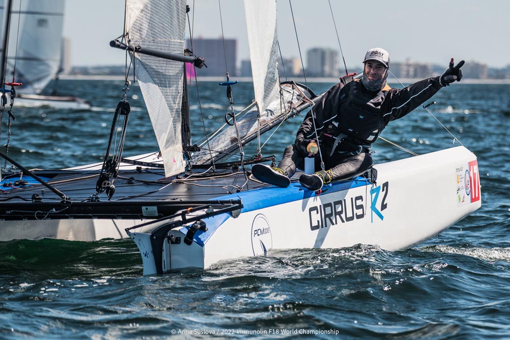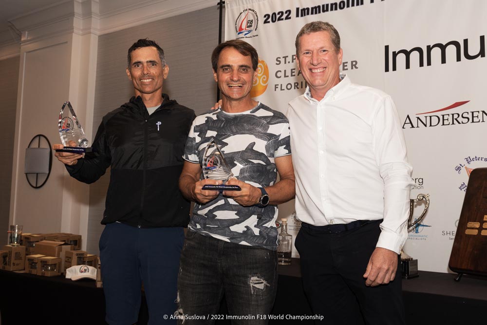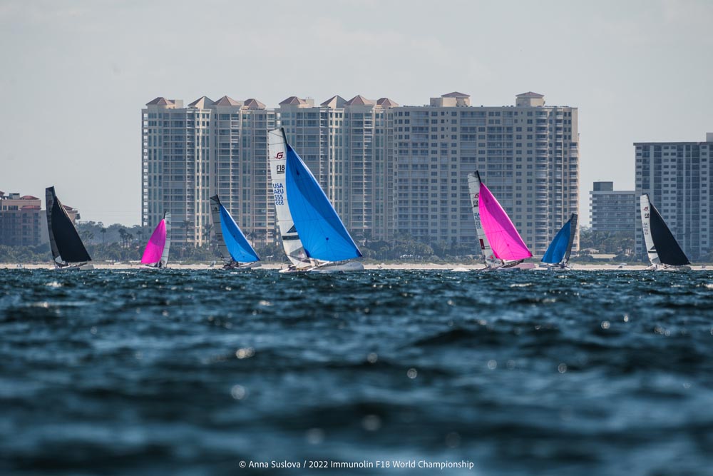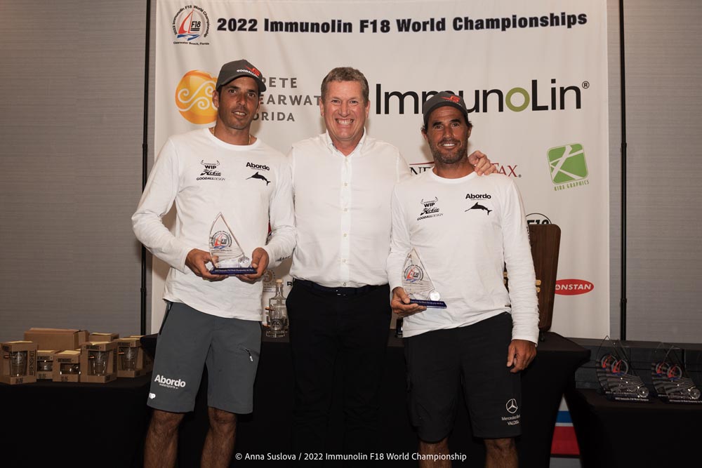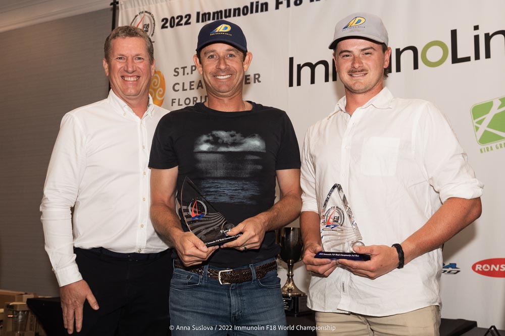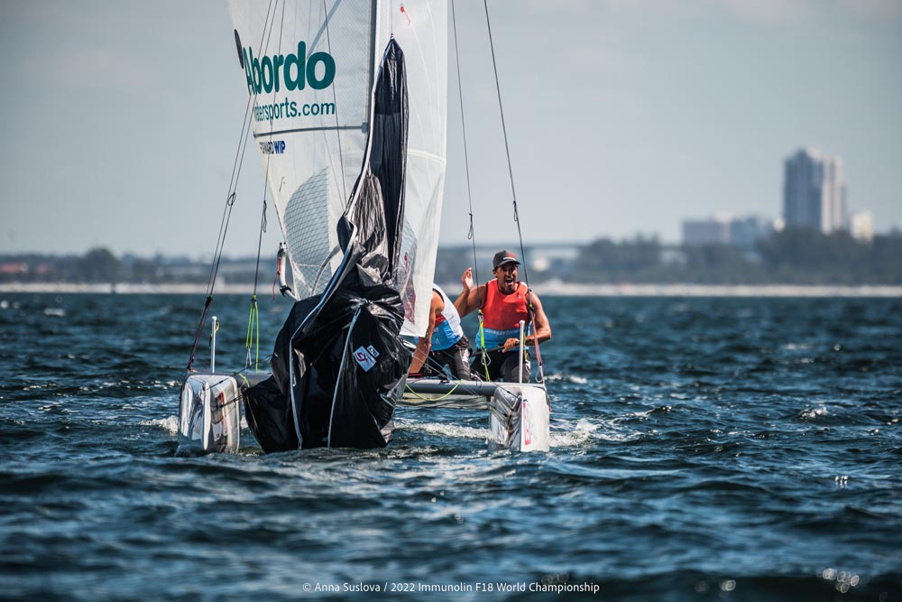 RESULTS Ravi Parent and Severin Gramm battled their way to win the 2022 Immunolin F18 World Championship in Clearwater Beach, Florida. Parent and Gramm kept their focus after a rough start to their day when they crossed the finish line first but received a UFD for going over the line early at the start. Australians Gavin Colby and Kai Colman took second, and Cruz Gonzalez Smith and Mariano Heuser finished third.