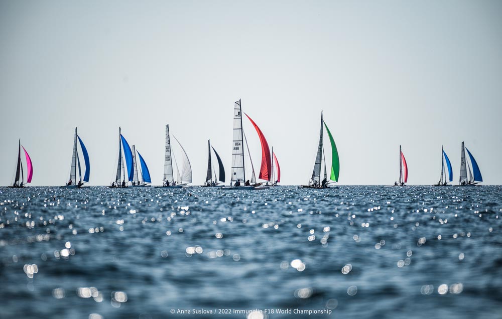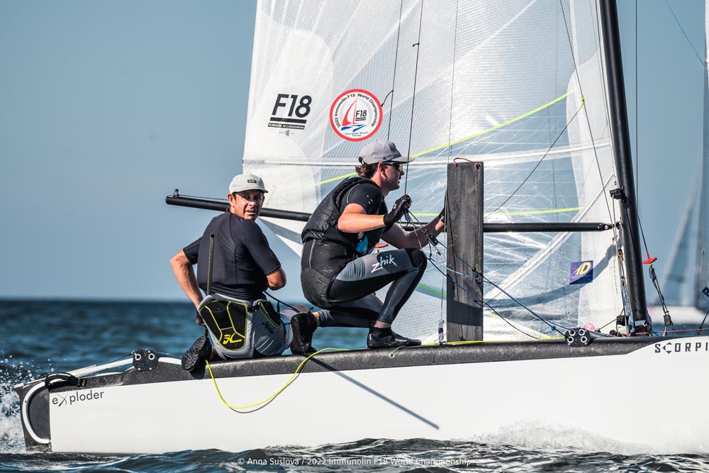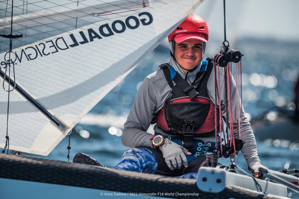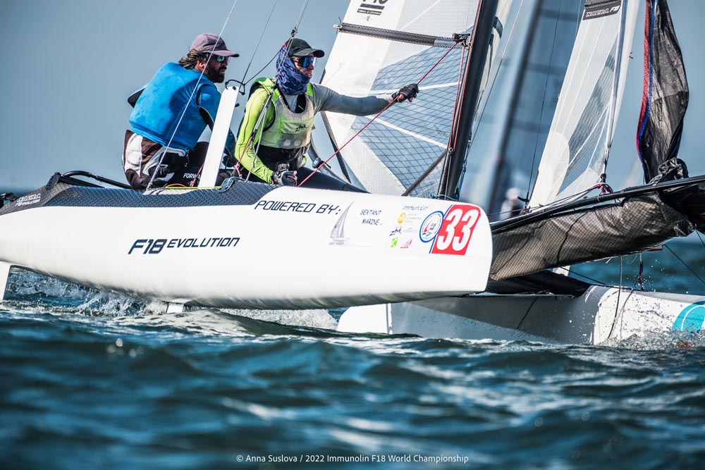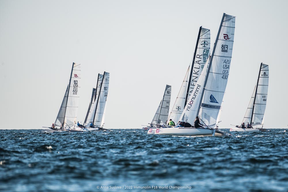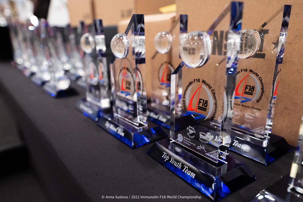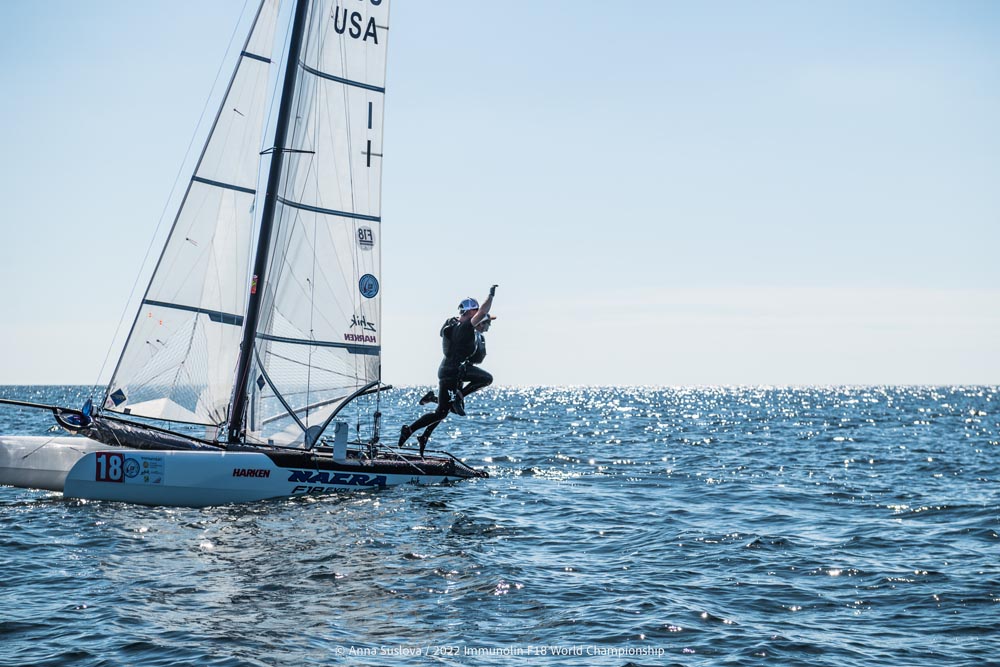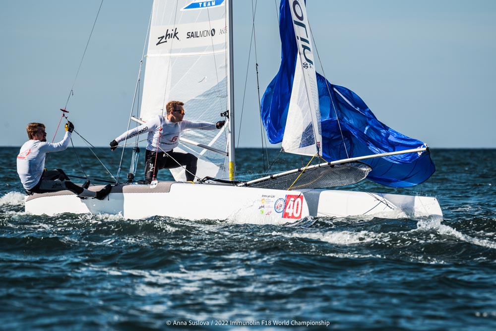 RESULTS Ravi Parent and Severin Gramm battled their way to win the 2022 Immunolin F18 World Championship in Clearwater Beach, Florida. Parent and Gramm kept their focus after a rough start to their day when they crossed the finish line first but received a UFD for going over the line early at the start. Australians Gavin Colby and Kai Colman took second, and Cruz Gonzalez Smith and Mariano Heuser finished third.