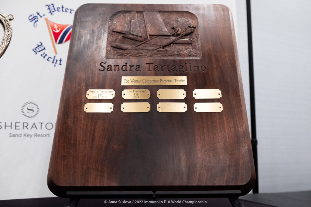 Elizabeth Frost was the youngest female competitor in the 2022 Immunolin F18 World Championship sailed in Clearwater Beach, Florida. Frost was awarded the “Sandra Tartaglino – Top woman competitor Perpetual trophy.” at the trophy banquet.