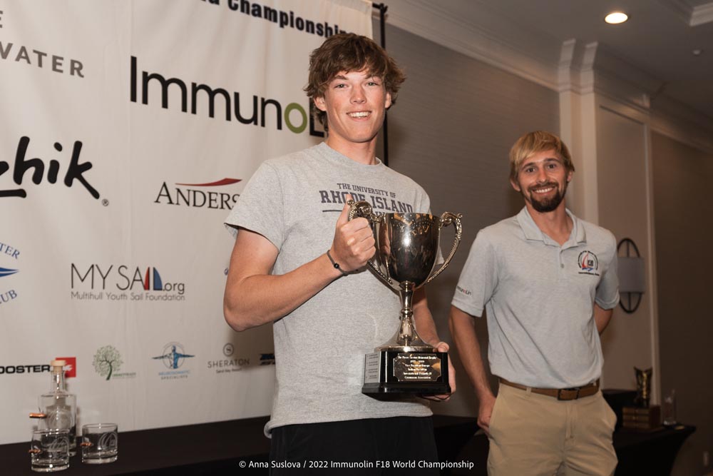 Olin Guck of Rhode Island received the Pierre Sicouri Perpetual Trophy at the 2022 F18 World Championship. Olin, who crews with his father Lars, placed 6th overall, and won race 8 in the 2022 F18 Worlds. The trophy is awarded to the highest ranking sailor under 23 at the F18 World Championship.