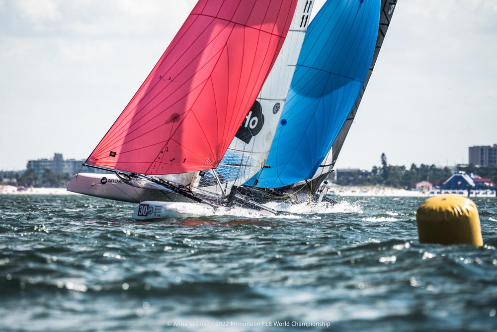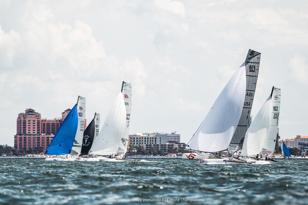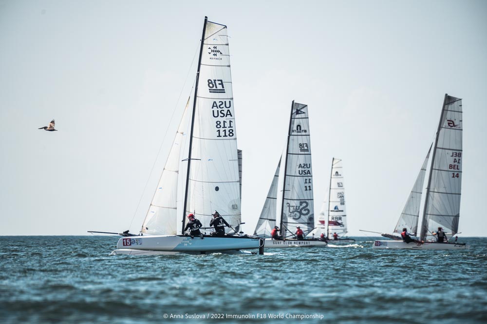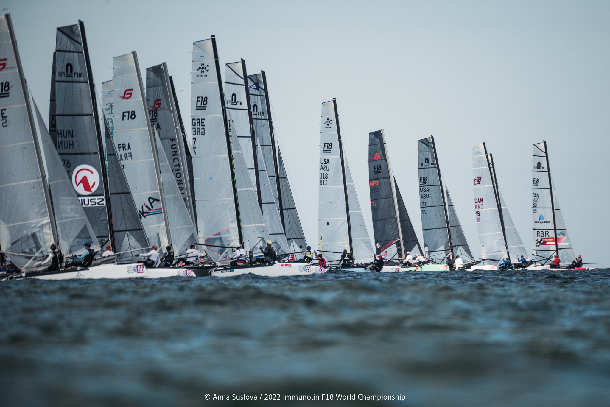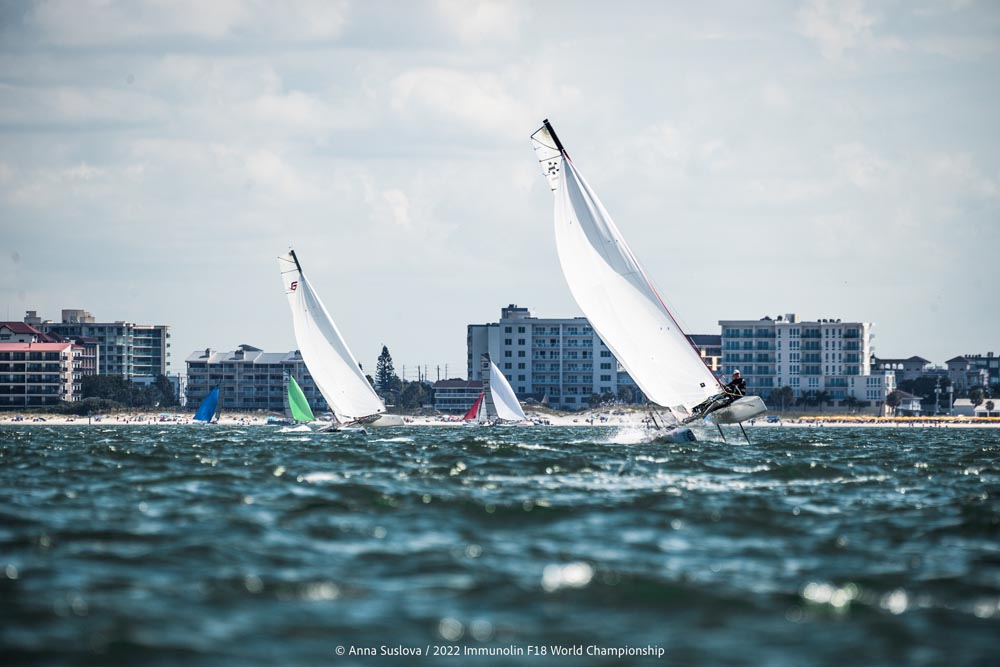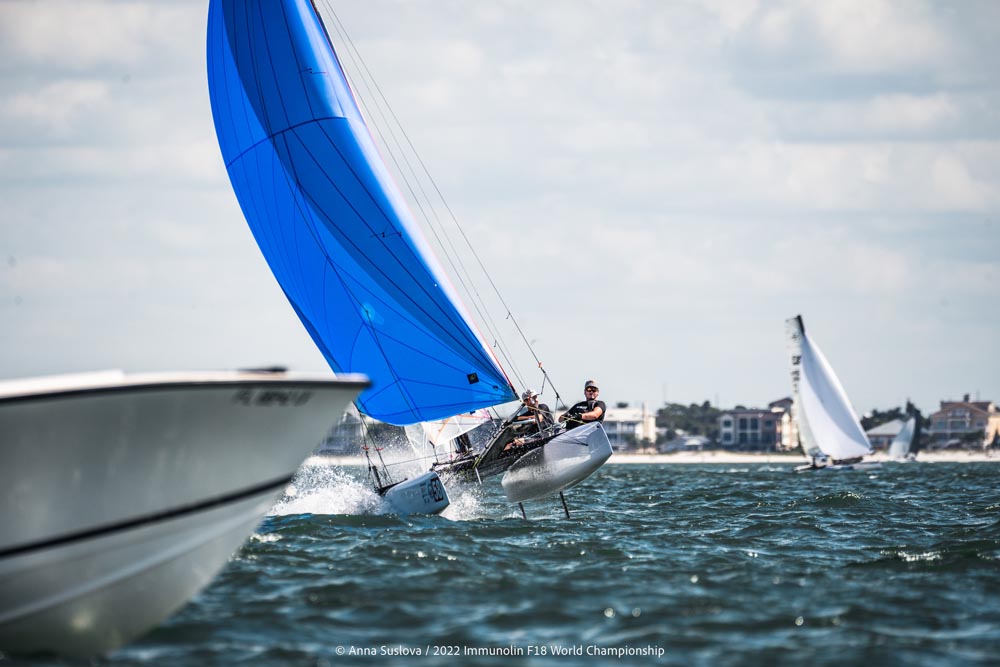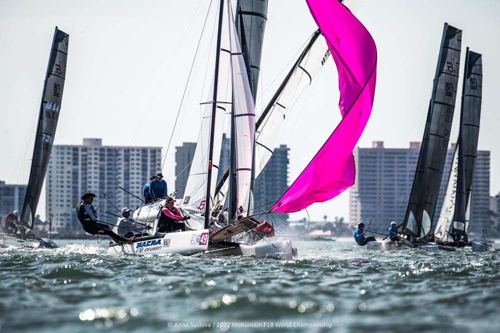Saturday’s earlier start time at the 2022 Immunolin F18 World Championship gave competitors a four-race day in various winds. The top 5 in the provisional standings are in a tight fight to win the title tomorrow, Sunday, October 16, the last day of racing. You’ll want to follow the live tracking and scoring race by race. The first warning time is at 1000 hours on Sunday.