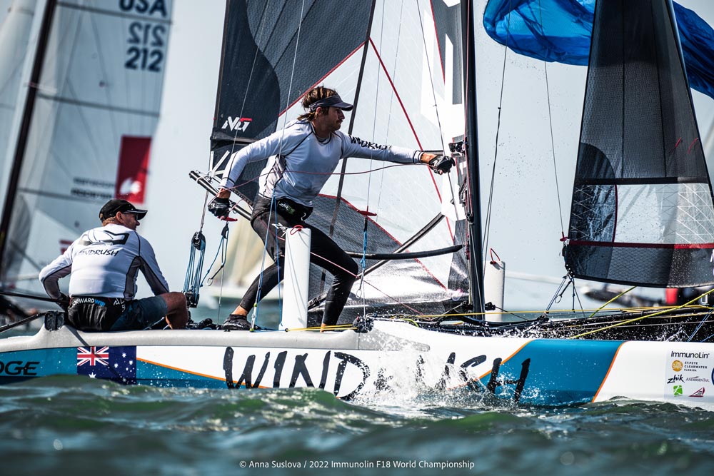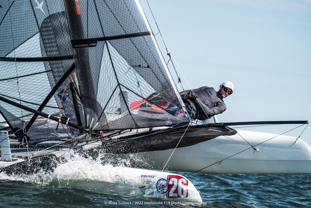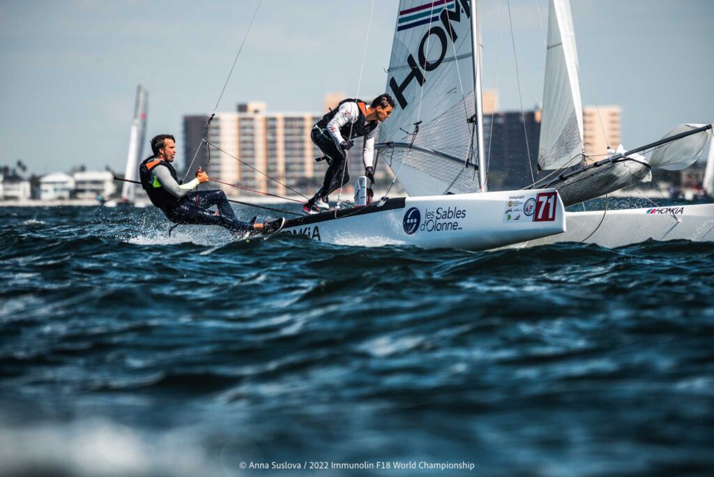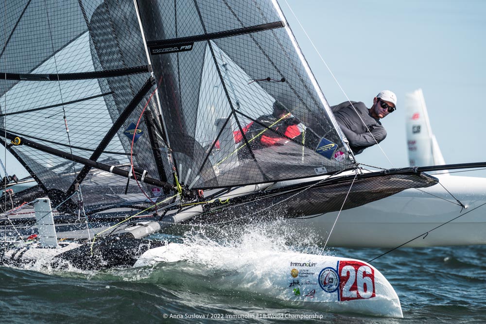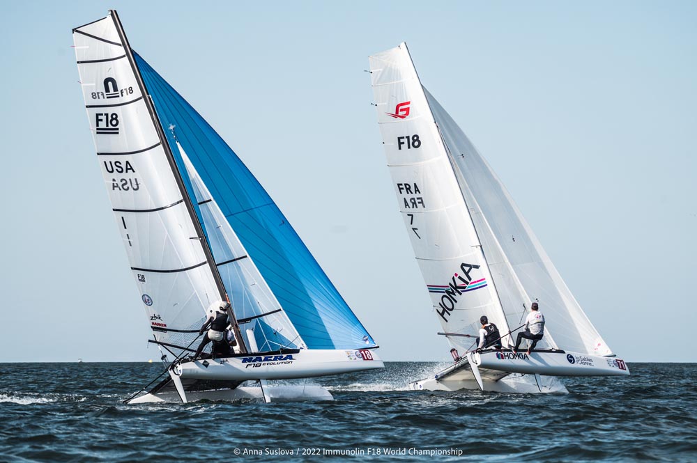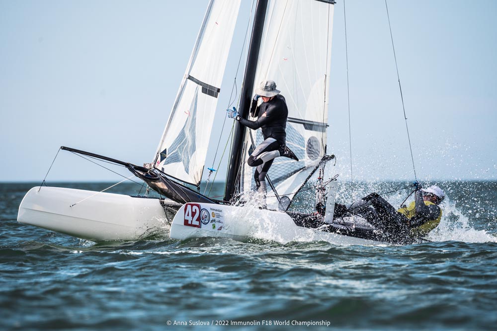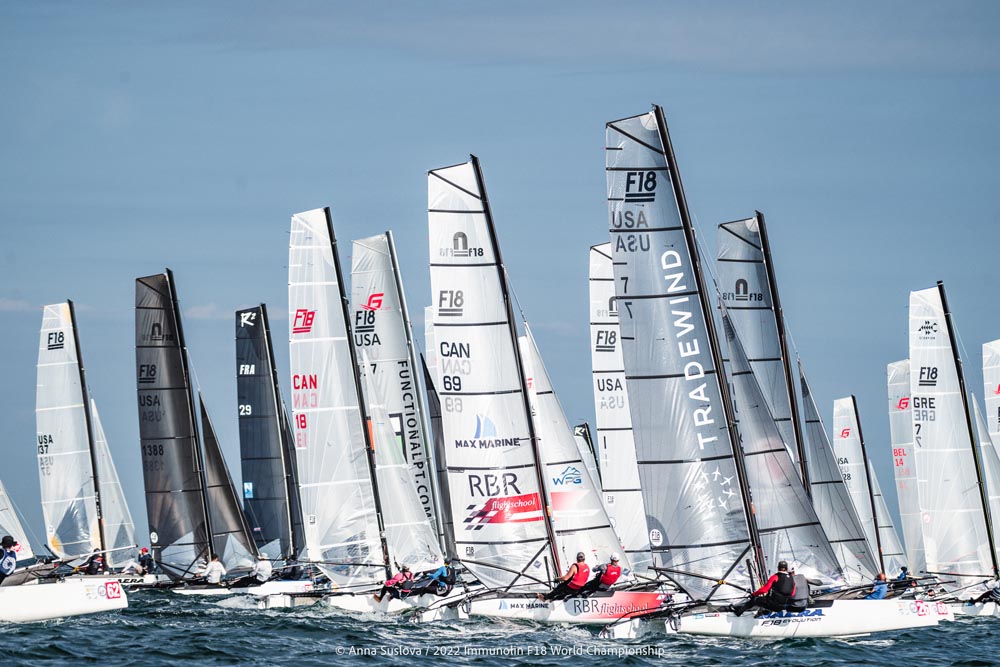Saturday’s earlier start time at the 2022 Immunolin F18 World Championship gave competitors a four-race day in various winds. The top 5 in the provisional standings are in a tight fight to win the title tomorrow, Sunday, October 16, the last day of racing. You’ll want to follow the live tracking and scoring race by race. The first warning time is at 1000 hours on Sunday.