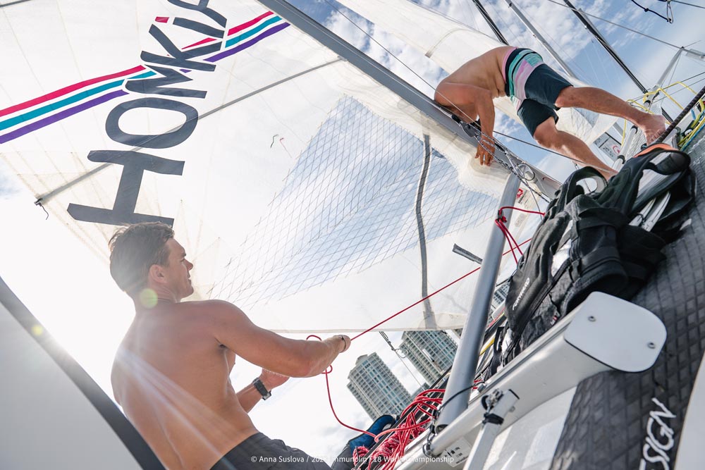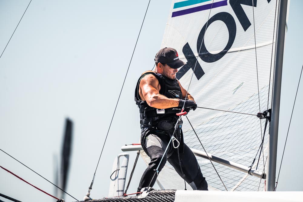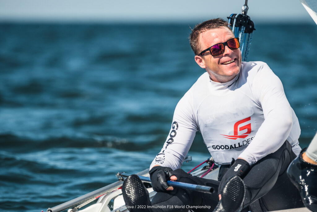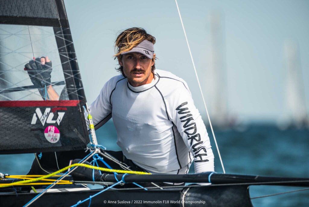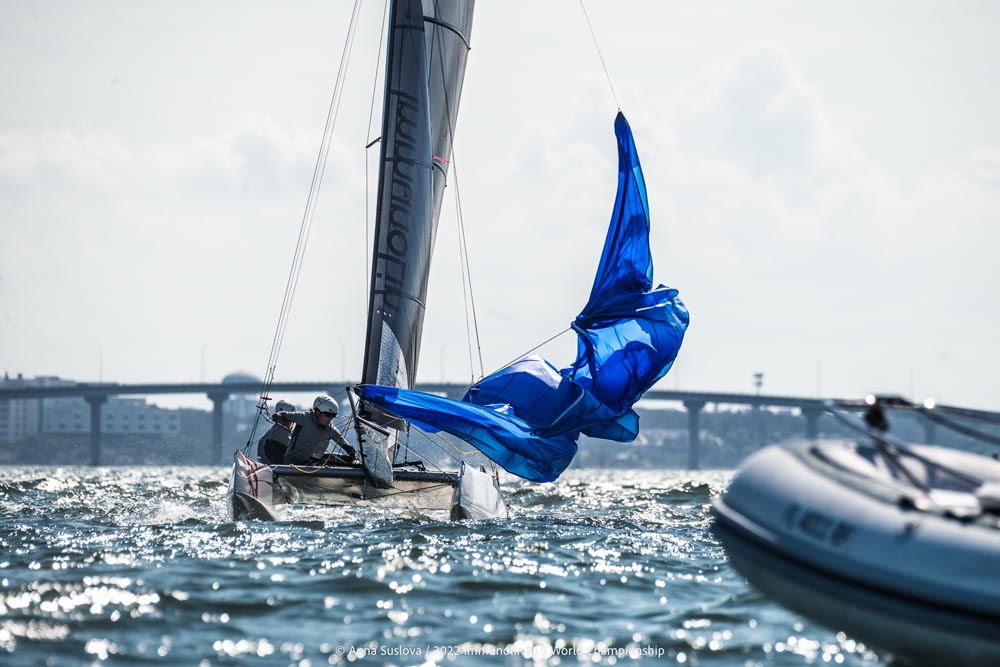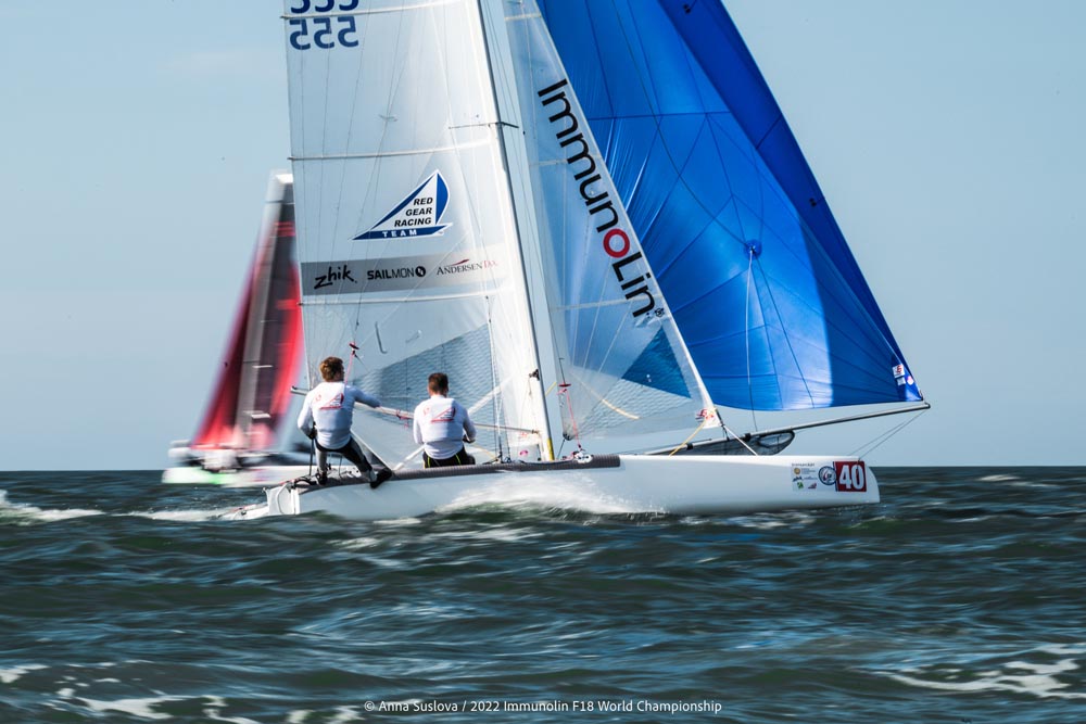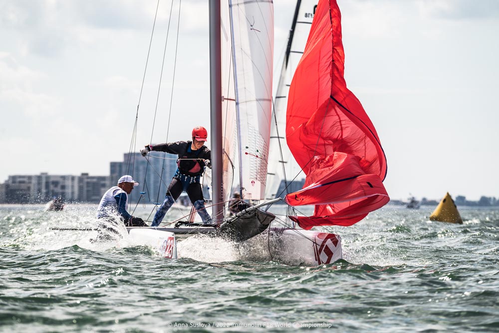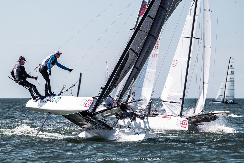 Saturday’s earlier start time at the 2022 Immunolin F18 World Championship gave competitors a four-race day in various winds. The top 5 in the provisional standings are in a tight fight to win the title tomorrow, Sunday, October 16, the last day of racing. You’ll want to follow the live tracking and scoring race by race. The first warning time is at 1000 hours on Sunday.