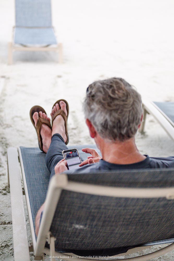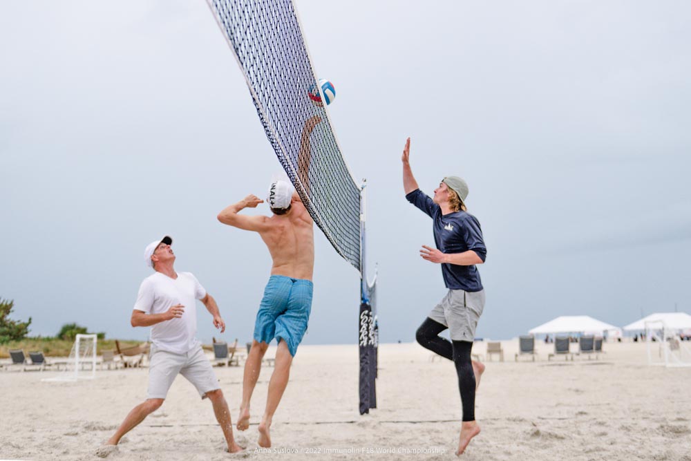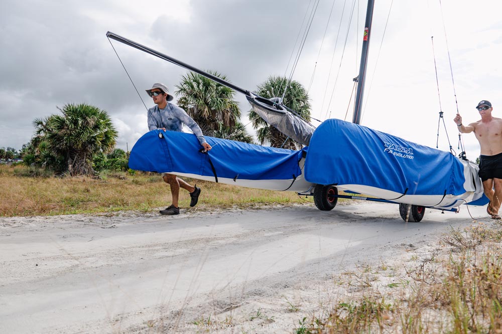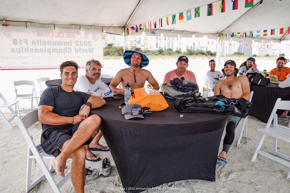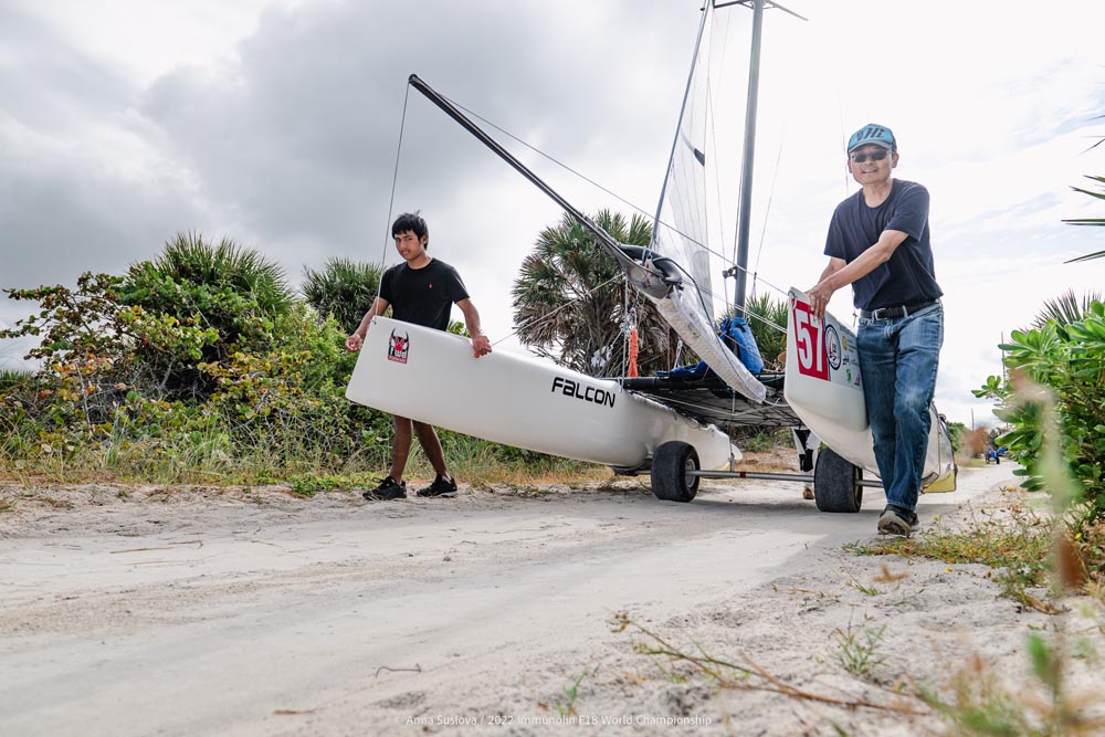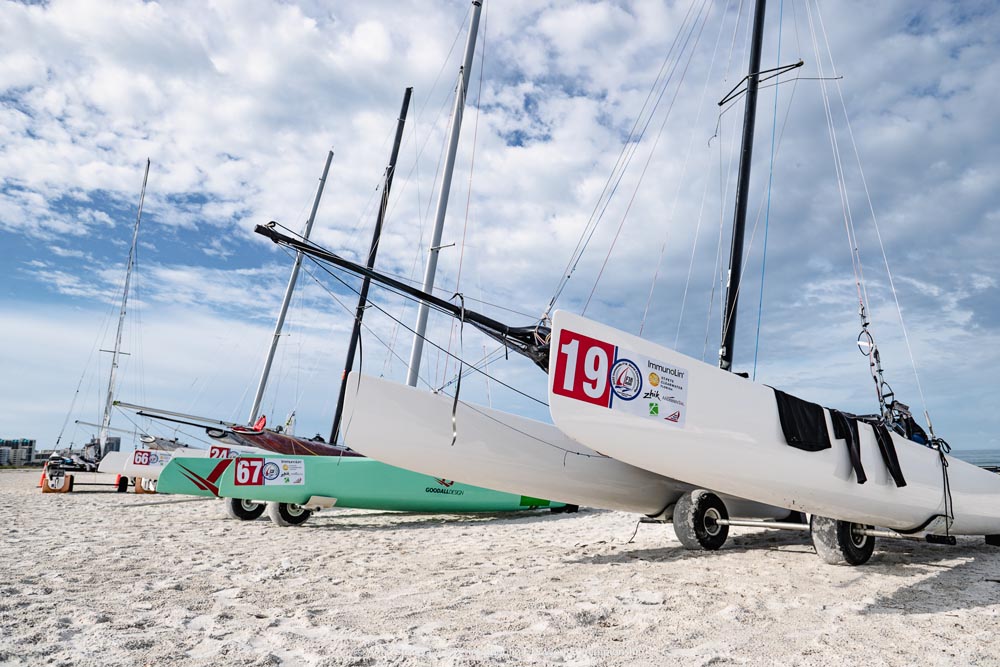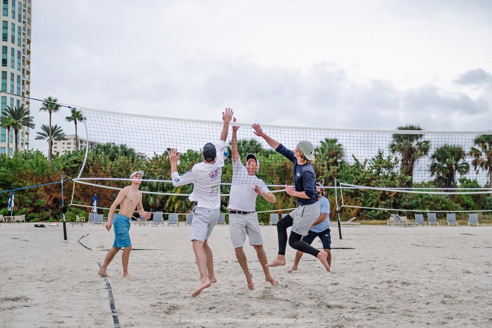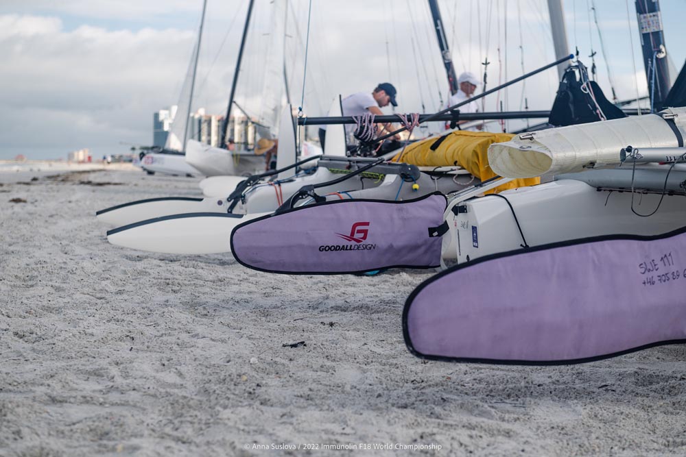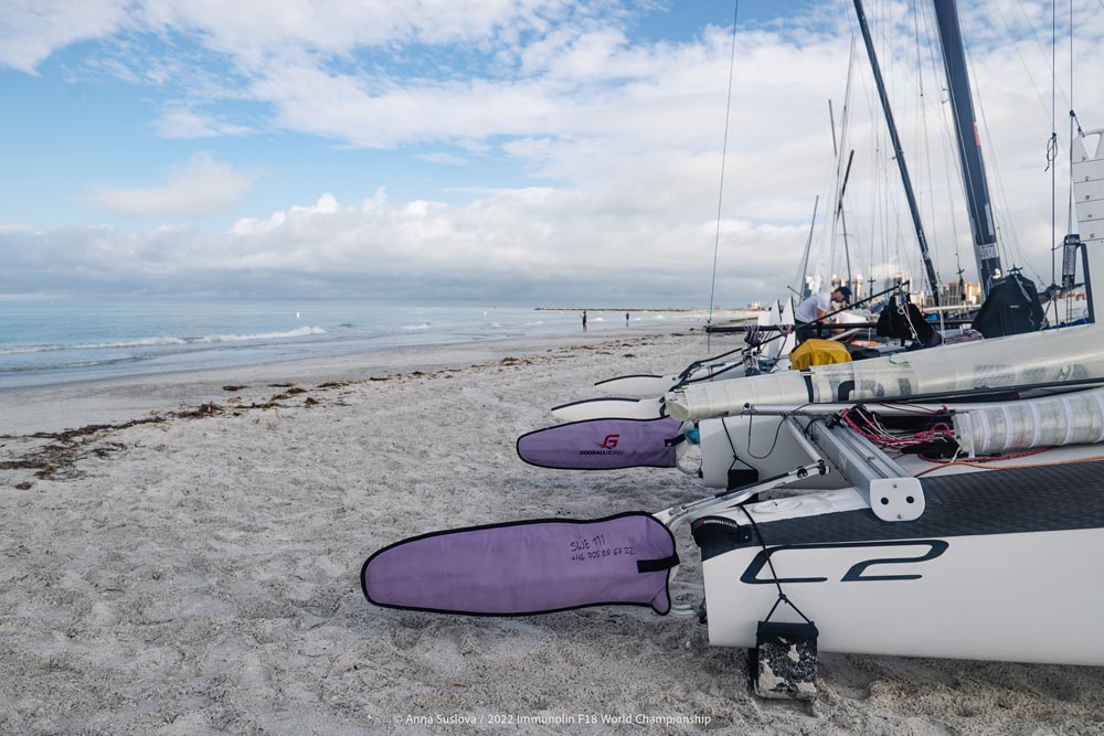 The wind was a no-show again on Day 2 of the 2022 Immunolin F18 World Championship in Clearwater Beach, Florida. The postponement presented competitors with the opportunity to take advantage of “America’s Best Beaches” for volleyball, boat tuning, or just relaxing on a beach chair. Race officials encouraged competitors to be prepared for a potential four race-day on Friday because the forecast is promising with a NNE breeze that will slowly shift left as the land heats up.